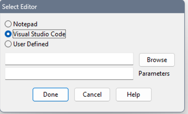 If you’re using the Visual Studio Code editor on Windows systems, select it in the Options -> Editor dialog. SwiftForth will launch it using the default code.cmd, which is placed in the user path by the VS Code installer.